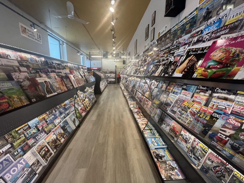 8割が雑誌。縦に長く、入り口から出口に向かってU字に陳列された本棚。