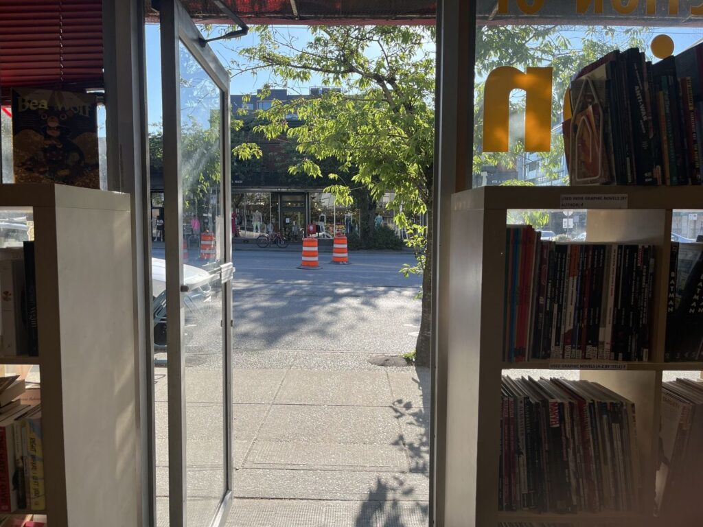 本屋めぐりの大トリは、バンクーバー3軒目のPulpfiction Books。店先にはゆったりと新刊、奥に進めばぎっちりと古本。赤髪の店員さん、赤色の壁紙、入口の向こうは青空。