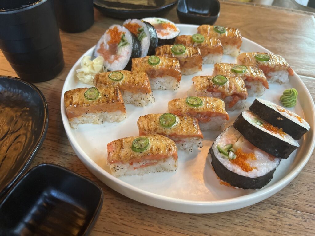 隣がめちゃくちゃ人気のジェラート屋さんなのでセット訪問が吉! 並びには炙り寿司のカフェもあります。大阪寿司風の押し寿司。サーモンがおいしゅうございました。